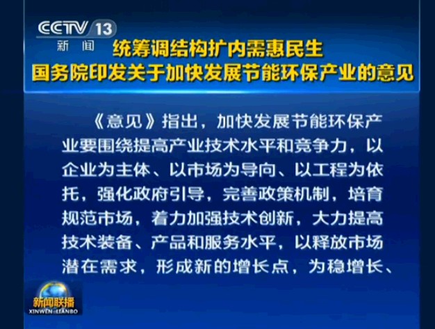 資源環(huán)境制約是當前我國經(jīng)濟社會發(fā)展面臨的突出矛盾。解決節(jié)能環(huán)保問題,是擴內(nèi)需、穩(wěn)增長、調結構,打造中國經(jīng)濟升級版的一項重要而緊迫的任務。加快發(fā)展節(jié)能環(huán)保產(chǎn)業(yè),對拉動投資和消費,形成新的經(jīng)濟增長點,推動產(chǎn)業(yè)升級和發(fā)展方式轉變,促進節(jié)能減排和民生改善,實現(xiàn)經(jīng)濟可持續(xù)發(fā)展和確保2020年全面建成小康社會,具有十分重要的意義。為加快發(fā)展節(jié)能環(huán)保產(chǎn)業(yè),現(xiàn)提出以下意見: